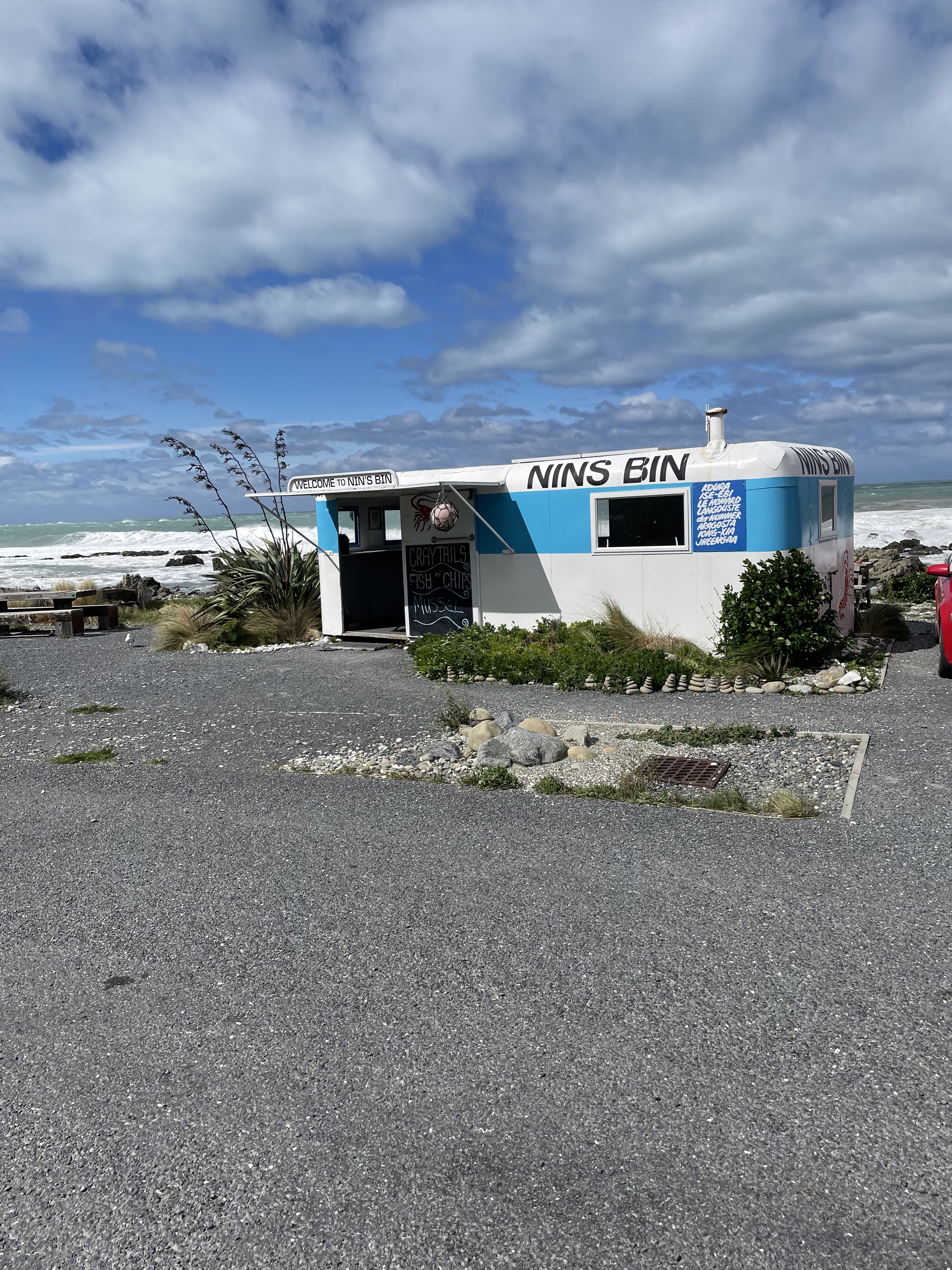 The East Coast of the South Island of New Zealand is where you will find the Kaikoura Coastline. Kaikoura on the coast north of Christchurch is the crayfish capital of New Zealand. The name Kaikoura means ‘eating crayfish’ in Maori. Seafood caravans (what we would normally call a food truck) can be found along the roads around Kaikoura selling fresh crayfish. We were told to find Nin’s Bin and have a crayfish tail and that is exactly what we did!