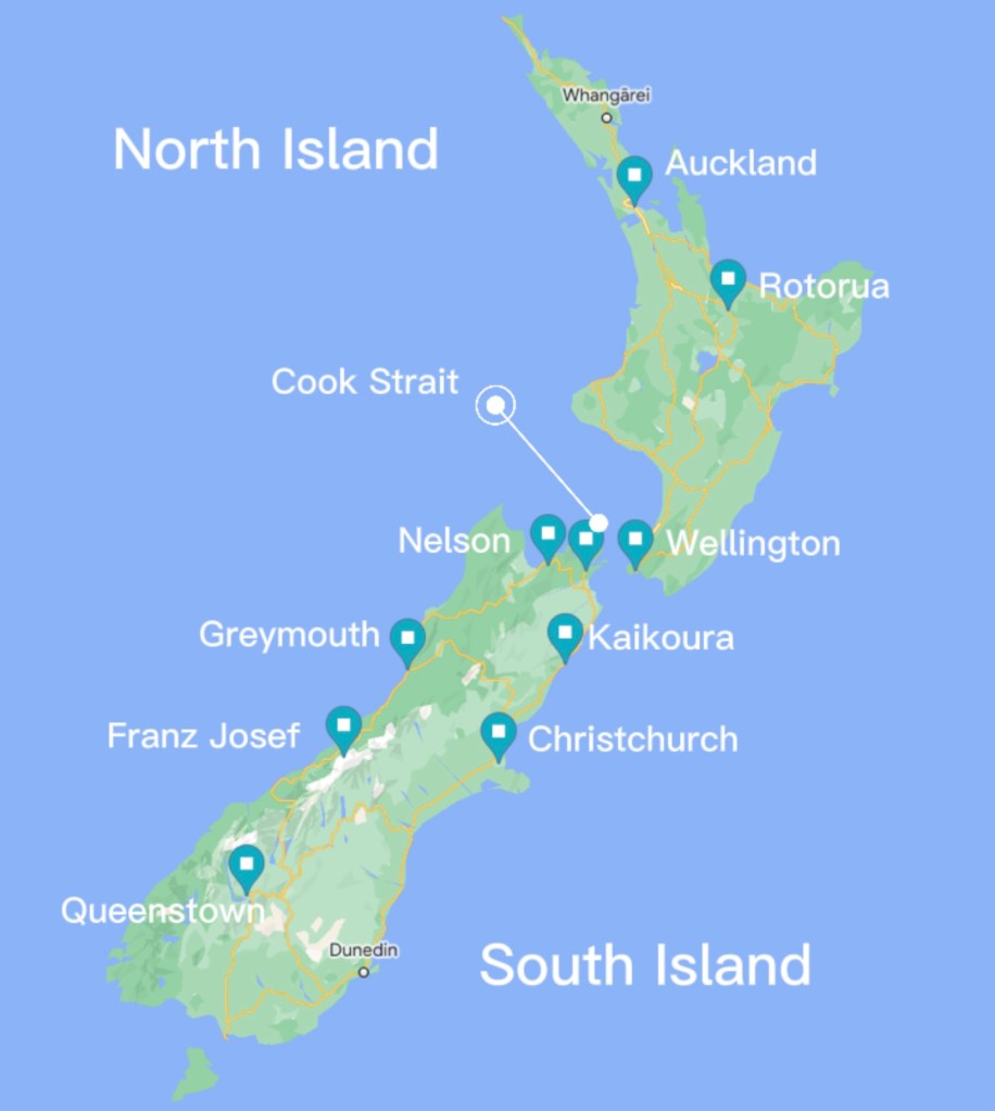 We arrived in New Zealead in Auckland and spent the first week exploring the North Island. If you missed the previous post you can read about it here. Below is a map to give you reference to some of the areas that we visited during our time here in the Land of Kiwis. Below are some highlights of our time on the South Island of New Zealand.