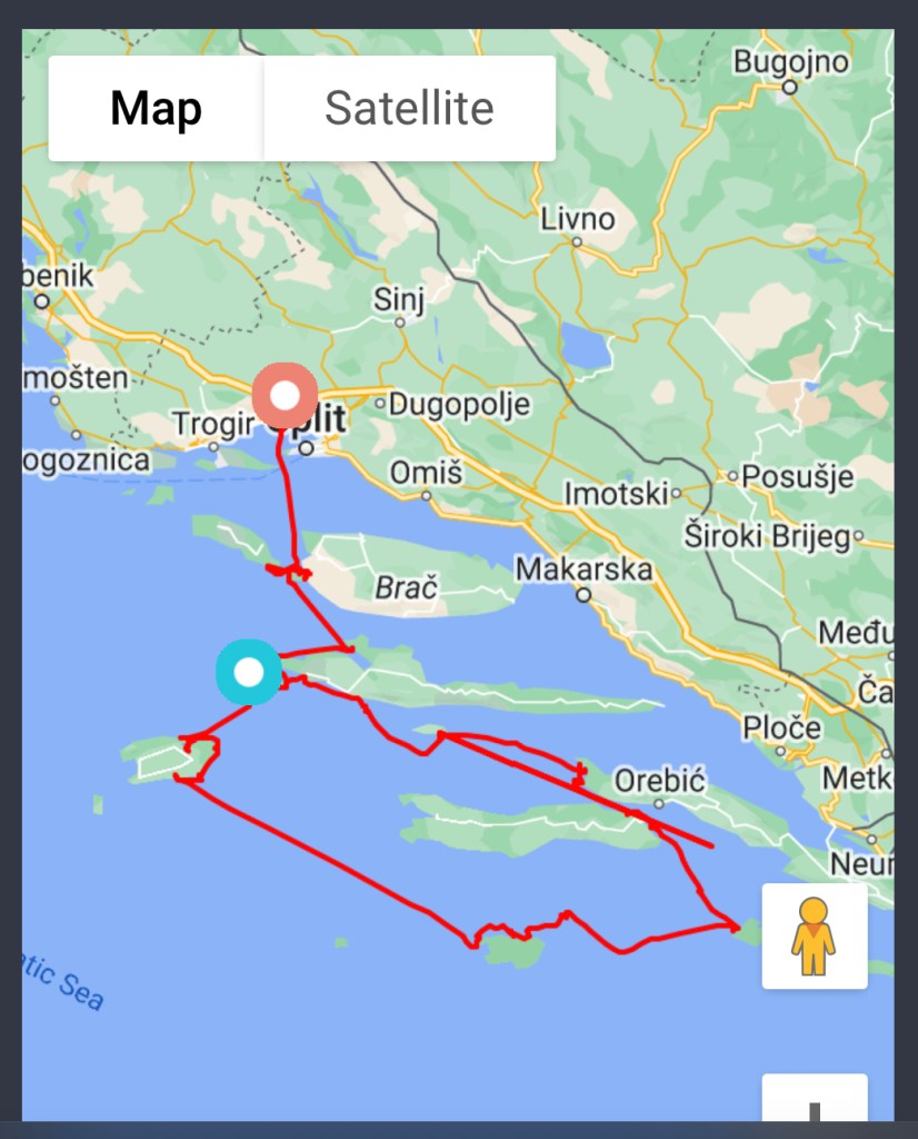 These two weeks were unforgettable and went by in the blink of an eye. What we most enjoyed was being on the water and to be able to enjoy the amazing coastlines. Instead of listing all the islands and each swim stop I thought it was easiest to give you a visual. While we stopped at the major islands you may be familiar with, Brac – Mrčara – Vis – Korčula – Hvar – Stari Grad – Milna, we also stopped at many other smaller places along the way. We spent the night at a different island each night and had one (and sometimes two) swim stops each day. Here is a gps map that I recorded to outline our route. (Note: I forgot on a few occasions to start the app but it gives you on overall view of our route)